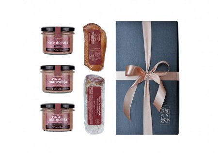 3 pate mixt / 1 salam mangaliță / 1 piept de rață / 1 cutie cadou