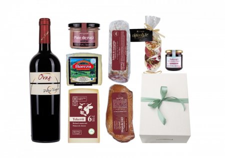 1 vin roșu / 1 brânză / 1 pate de mangaliță / 1 dulceață / 1 cutie cadou