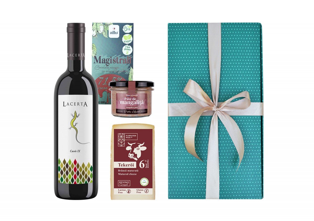 1 vin roșu premium / 1 brânză maturată / 1 pate mangaliță / 1 ciocolată cu alune / 1 cutie cadou
