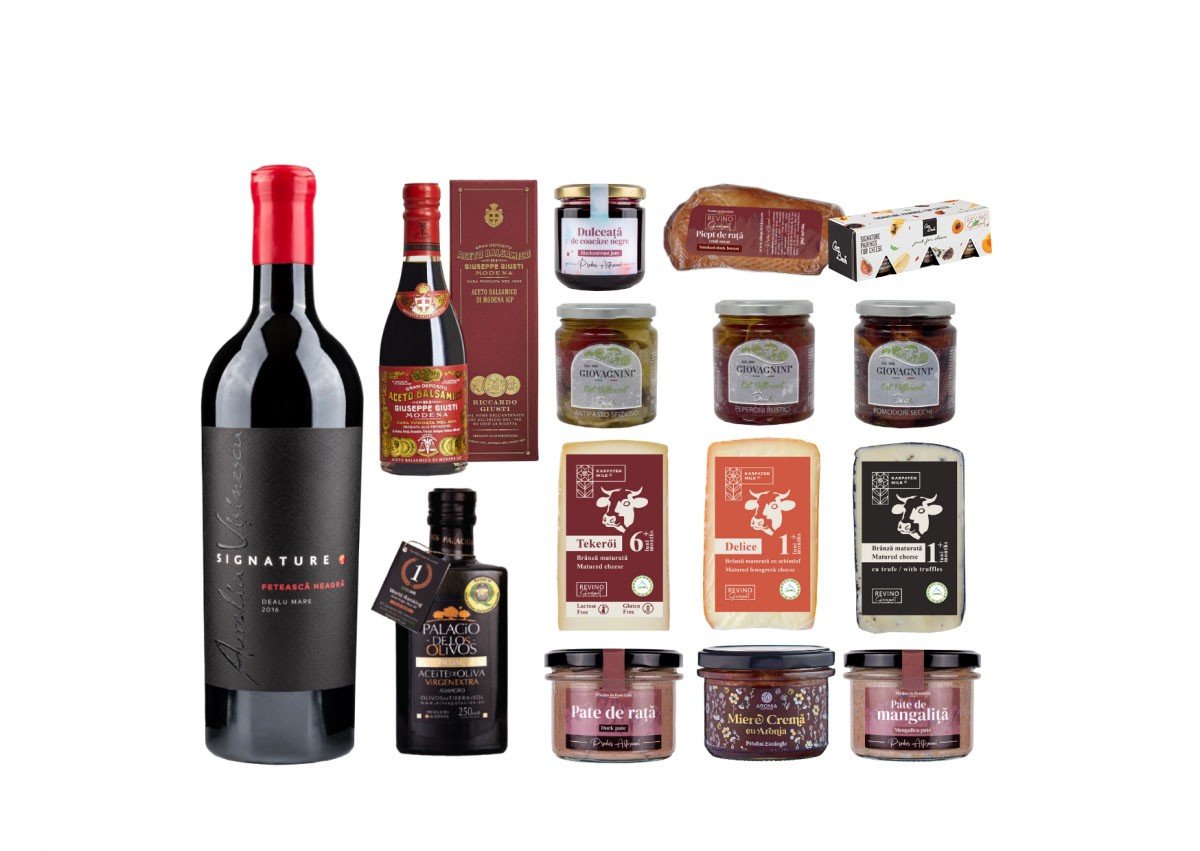 Cadouri gastronomice cu vinuri, brânzeturi, specialități carne și dulceață