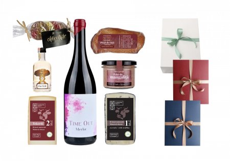 1 vin / 2 brânzeturi / 1 pate de mangaliță / 1 piept rață / discuri ciocolată / 1 țuică / 1 cutie cadou