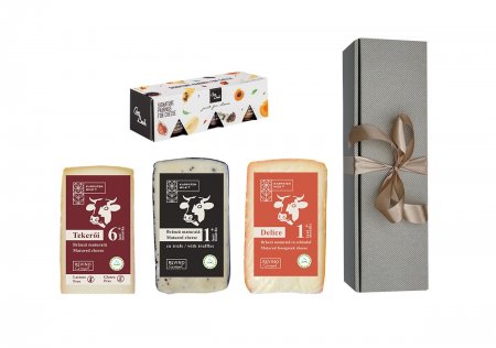 1 brânză cu schinduf / 1 brânză vacă / 1 brânză vacă cu trufe / 1 set sosuri pentru brânzeturi / 1 cutie cadou